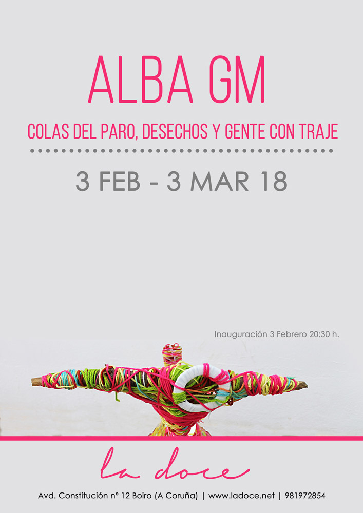 Colas del paro, desechos y gente con traje es una exposición de diversas obras de la artista AlbaGM que guardan una relación temática: El Estado español y la crisis económica. En esta exposición encontraremos las obras de Bestiario del Desecho, unos enormes animales deformes que salen de los escombros para recordarnos las ingentes cantidades de objetos que consumimos en nuestros días de bonanza; la serie de fotolitografías de Colas del paro, Torres Bankia y Suicidos junto a una serie de mini-esculturas llamadas Cualquieras representando una cola del paro y, por último, la serie de cuadros de Habitantes: Gente con Traje donde una serie de seres superiores vestidos de traje aterran a otros seres más pequeños y sumisos. En esta muestra podemos ver las diferentes facetas de la artista entorno al tema más reiterativo de su creación artística.